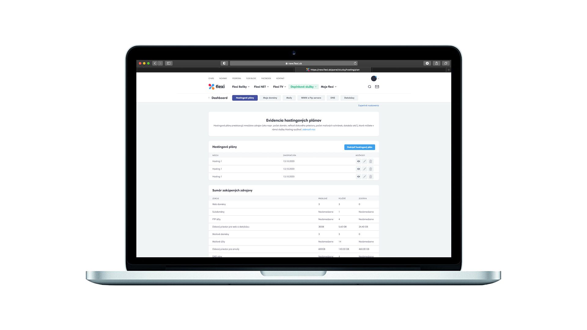 Prostredníctvom služby flexi HOSTING môžete spravovať svoje www stránky, FTP účty, databázy, internetové domény alebo spravovať mailové schránky.